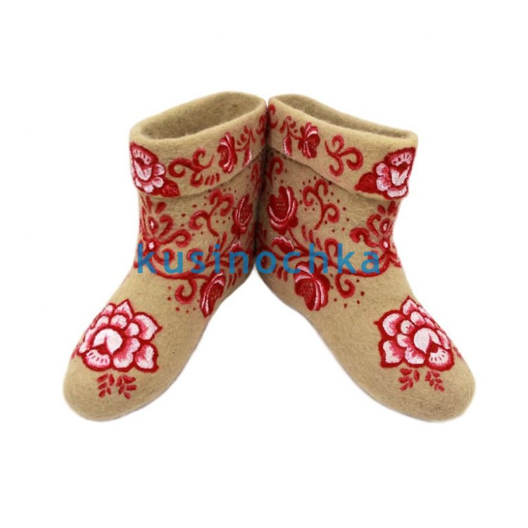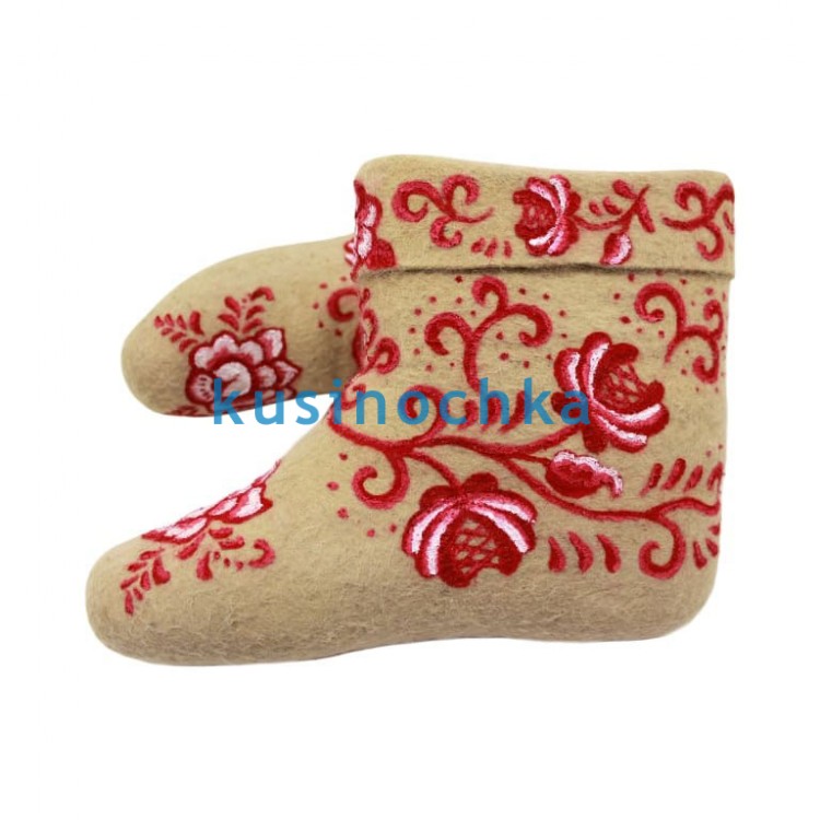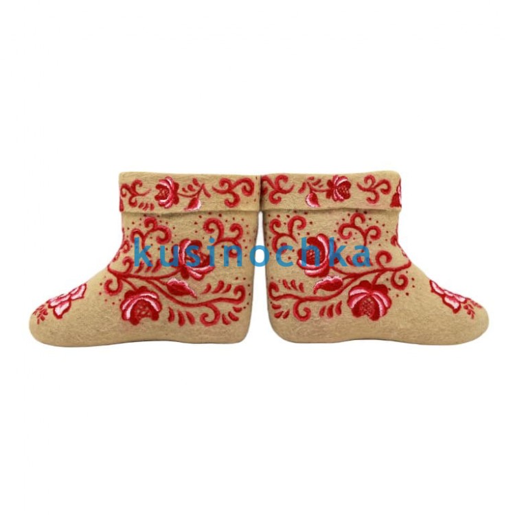 Это не копия, а вольная интерпретация: композиция адаптирована под форму валенка, с сохранением ритма и баланса, присущих народному орнаменту, но без строгой привязки к канону.