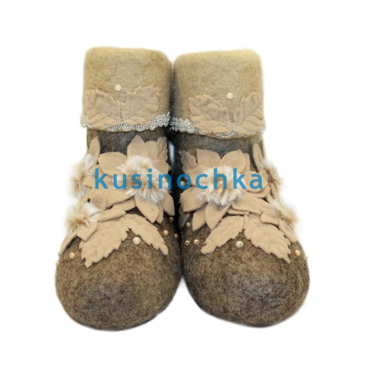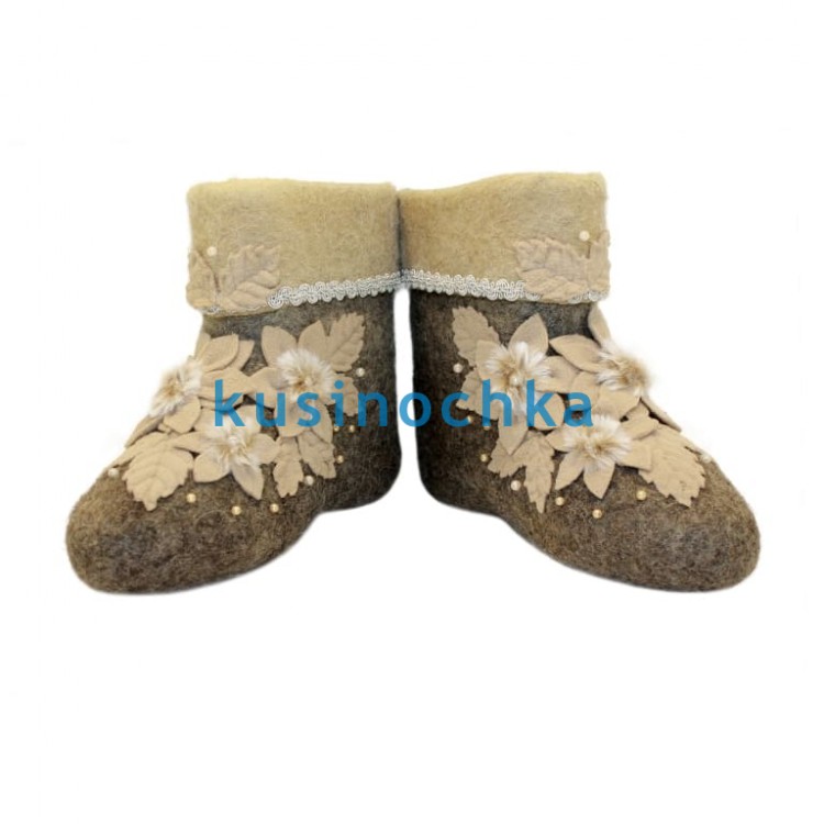 Полуваленки ручной валки на серой основе, с светлыми отворотами. Главный акцент — объёмная аппликация в виде роз, выполненная методом художественного валяния из натуральной шерсти. Лепестки слегка возвышаются над поверхностью, сохраняя мягкость и естественную текстуру — их можно трогать, гладить, чувствовать.
