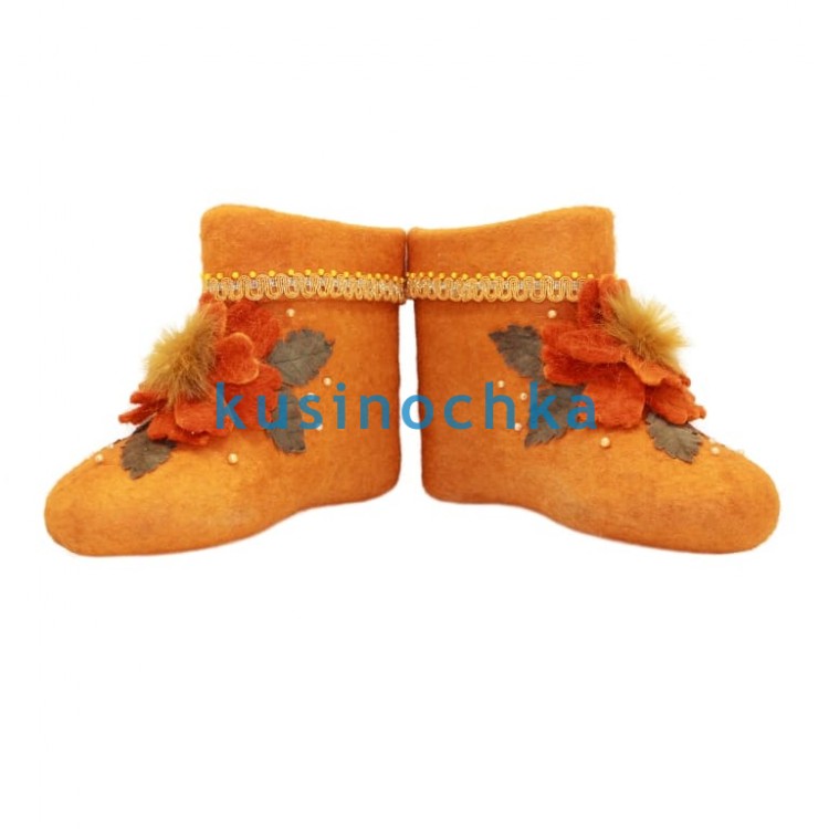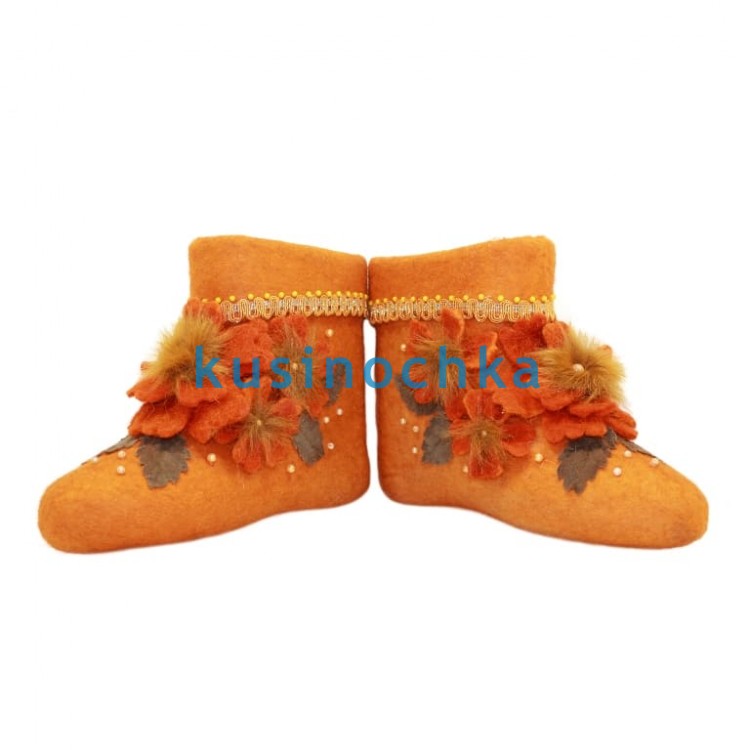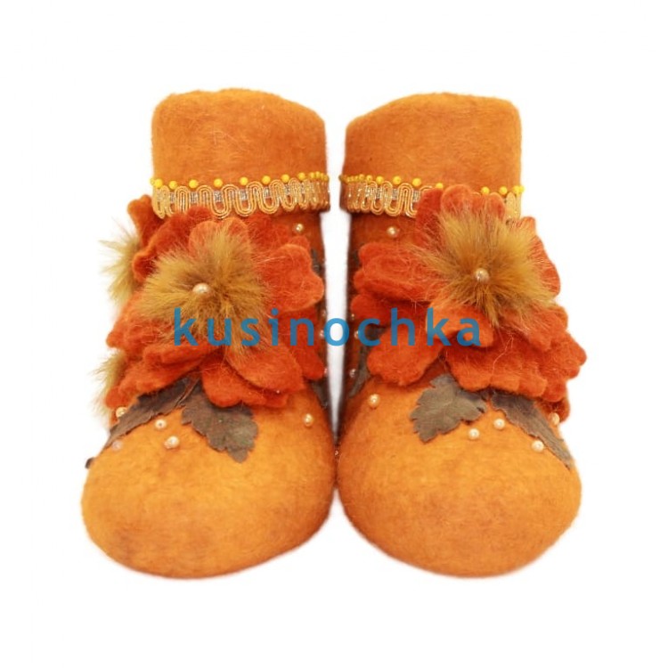 Полуваленки ручной валки на оранжевой основе, с объёмной аппликацией в тон: ткань, бусины, фрагменты натурального меха и тесьма — всё в оранжевой гамме (от персикового до насыщенного тыквенного). Аппликация — выпуклая, тактильно выразительная: создаёт эффект «тёплого взрыва» на фоне зимы.