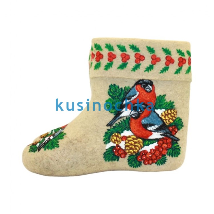 Полуваленки ручной валки на светлой основе, с художественным рисунком, передающим тихую зимнюю сцену: на передней части — пара снегирей на заснеженной еловой ветке, на отворотах — веточка рябины с ягодами. Композиция выдержана в природной гамме: белый и серо-голубой (снег, ветви), насыщенный красный (грудки птиц, ягоды), тёмно-зелёный (хвоя), чёрный (контур, детали оперения).