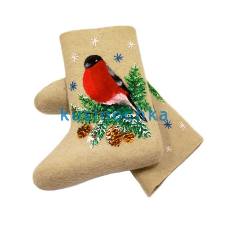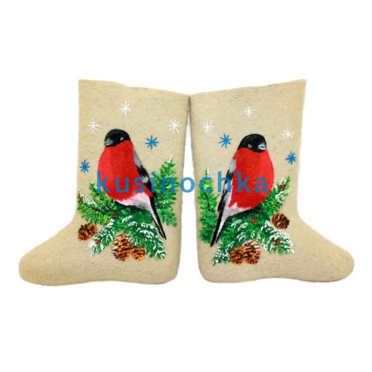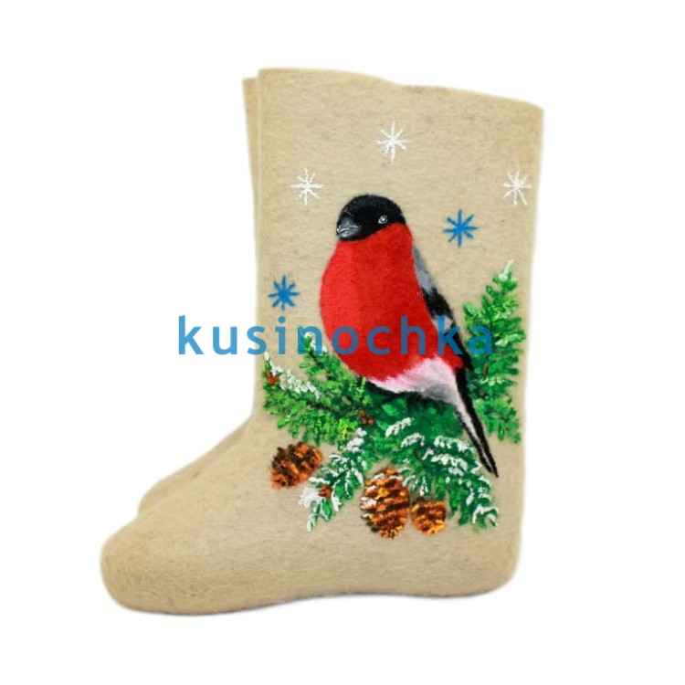 Полноразмерные валенки ручной валки на светлой основе, с художественным рисунком, выполненным акриловыми красками: снегирь на еловой ветке, над которым — лёгкий «дождь» из стилизованных снежинок, спускающихся по диагонали. Образ выдержан в сдержанной зимней гамме: белый и серо-голубой (снег, небо), насыщенный красный (грудка птицы), тёмно-зелёный (хвоя), чёрный (контур, детали).