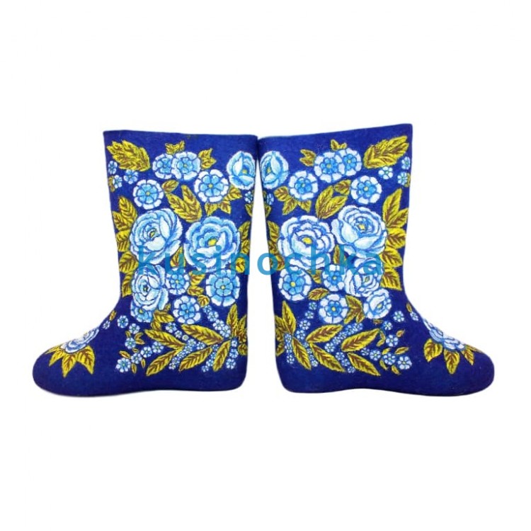 Полноразмерные валенки ручной валки на синей основе, с декоративным цветочным узором: голубые цветы в сочетании с листьями золотисто-зелёного оттенка. Композиция стилизована — не натуралистичная, а сбалансированная по объёму и ритму: крупные бутоны чередуются с изящными листьями, создавая ощущение завершённого, но не перегруженного орнамента.