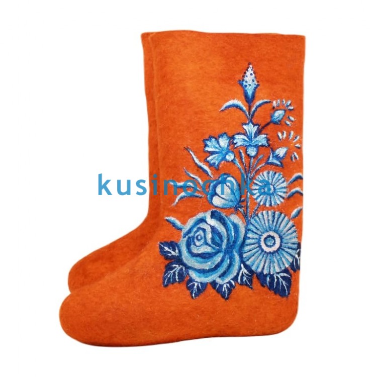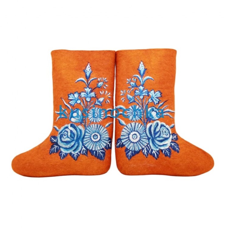 Полноразмерные валенки ручной валки на оранжевой основе, с цветочным узором в холодной гамме: синие, голубые и белые элементы переплетаются в лёгкую, стилизованную композицию — как отблеск утреннего неба на тёплом свете рассвета.