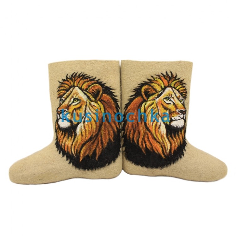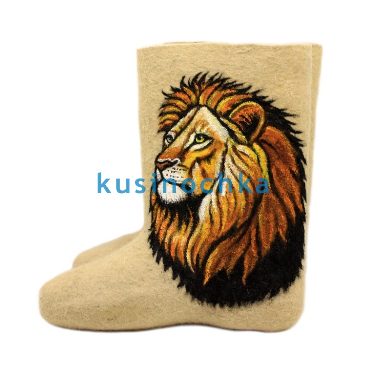 Полуваленки ручной валки на светлой основе, с художественным рисунком — голова льва, изображённая анфас. Грива — объёмная, стилизованная, с намёком на лучи; взгляд — прямой, но не агрессивный. Образ — не король зверей как метафора власти, а как символ достоинства, зрелости, внутренней силы.